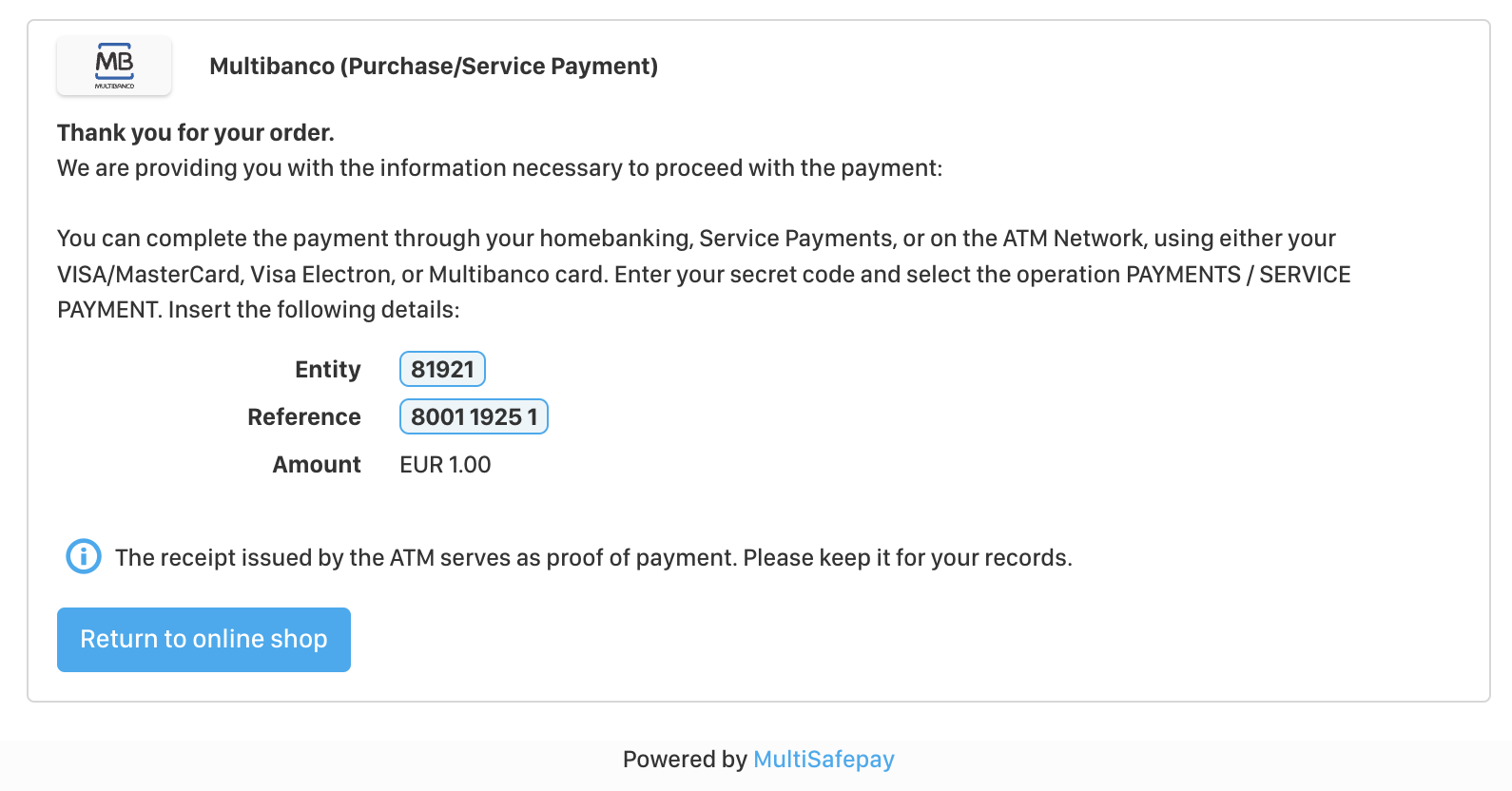 Multibanco is a payment method in Portugal that allows the customer to complete payment through home banking, service payments, or on the ATM Network.